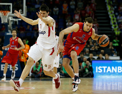 -Κεντρικός στόχος στο αμυντικό πλάνο του Γιώργου Μπαρτζώκα ήταν να πάρει τη μπαγκέτα από τα χέρια του Μίλος Τεόντοσιτς, αποκόβοντας τον από τους συμπαίκτες του. Είναι γνωστό το πόσο καλά λειτούργησε πολλές φορές η επίθεση των Ρώσων, με παιχνίδι χωρίς τη μπάλα από τους τρείς κατ’ουσία φόργουορντς (Ουίμς-Μίτσοβ-Κριάπα) και τον Σέρβο πόιντ στη δημιουργία. Ο Ολυμπιακός χρησιμοποίησε hedge out άμυνα στα πικ εν ρολ που έπαιρνε ο Τεόντοσιτς με τον παίκτη των Πρίντεζη-Άντιτς, σταματώντας του κατευθείαν την ντρίμπλα με κάθετη άμυνα ενώ αντίθετα με τους Χάινς-Σερμαντίνι επέλεξε πλάγια βήματα ώστε να τον οδηγήσει στις γωνίες υπό μορφή παγίδας. Από την αρχή (και διατηρώντας φρέσκο παίκτη πάνω του) οι ερυθρόλευκοι έβγαλαν εκτός του Σέρβο, ο οποίος δεν «πάτησε» ποτέ στο παιχνίδι και φανέρωσε το «πτωχόν» της περιφερειακής γραμμής της ΤΣΣΚΑ. Κάθε φορά που η δυναμική άμυνα της ελληνικής ομάδας στα πικ εν ρολ του αντιπάλου «έβγαζε» τη μπάλα από τα χέρια του Τεόντοσιτς στο χρόνο που ήθελε αυτή, περιορίζοντας τον δικό του χρόνο σκέψης και τοποθετώντας ολόκληρη την ΤΣΣΚΑ σε διαδικασία άμεσης επίθεσης