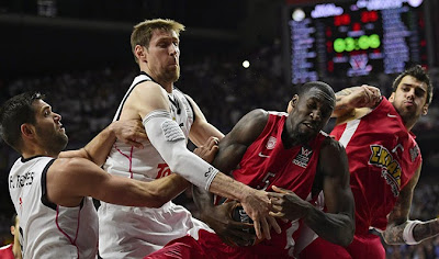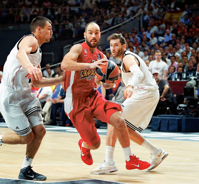 Ο Ολυμπιακός ήταν επίσης αρκετά διαβασμένος και ο τρόπος που ξεκίνησε τον τελικό είναι ενδεικτικός. Εικόνα ομάδας που ξέρει τι θέλει και που να κατευθύνει το ματς μέσα από την εξαιρετική σε όλα τα επίπεδα (χρόνοι, σκληράδα, ετοιμότητα/διάβασμα, συγκέντρωση) άμυνα του. Σε αυτά τα 10 πρώτα λεπτά οι ερυθρόλευκοι μας έδωσαν εικόνα νικητή. Ο κόουτς Σφαιρόπουλος επέλεξε μια Switch-everything άμυνα η οποία είχε ως στόχο να μην αφήσει ελεύθερα σουτ και ευκαιρίες στους «κάθετους παίχτες» της Ρεάλ ώστε η επίθεση των γηπεδούχων να μη πατήσει με το καλημέρα. Αυτή του η επιλογή έδωσε στον Ολυμπιακό το τιμόνι. Τα γκαρντς της ελληνικής ομάδας έφτυσαν αίμα να μείνουν μπροστά από τους ψηλούς της Ρεάλ στη πίσω γραμμή ενώ όλοι νομίζω κατάλαβαν πόσο δύσκολο είναι να παίξεις πάνω σε παίχτες όπως ο Πετγουέη από έξω προς τα μέσα (είτε μετά από απομόνωση είτε σε καταστάσεις close out).